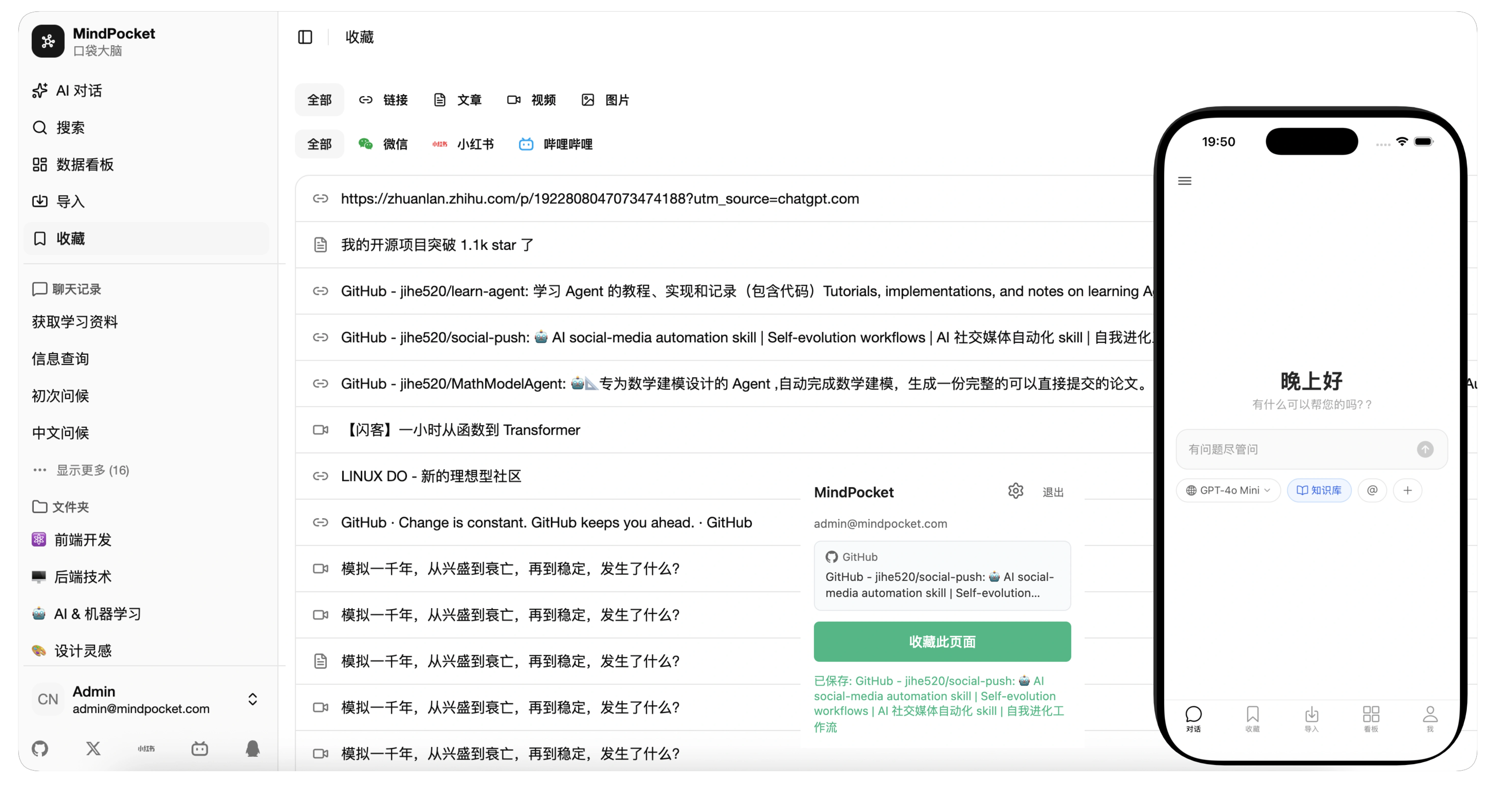 这才是核心卖点。MindPocket 集成了 RAG 和 AI Agent: